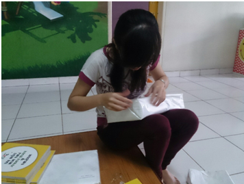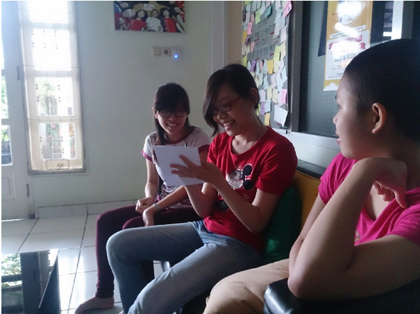 Sesampainya disana kami meminta tanda tangan surat pernyataan bahwa kami benar telah melakukan kegiatan sosial kami sebagaimana yang telah ditentukan oleh dosen dan TFI. Lalu dikarenakan saat itu Ibu Esther sedang sibuk dan buru-buru ingin mengantar salah satu anak disana untuk ke Rumah Sakit Harapan Kita maka kami pun tidak berlama-lama lagi. Kami sempat berfoto dengan Ibu Esther.